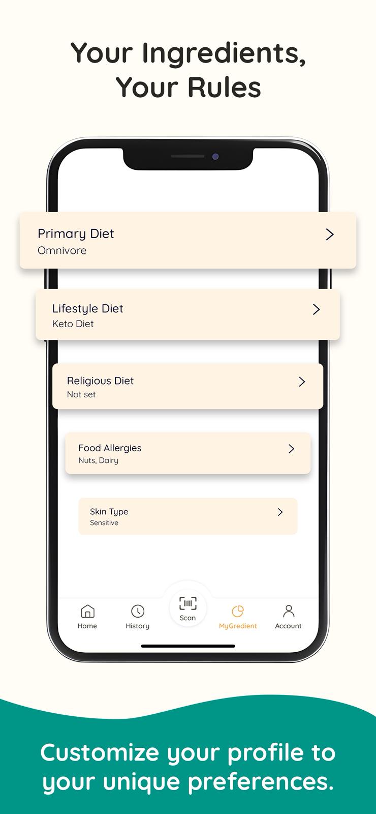 Discover smarter choices with MyGredient. Our AI-powered app helps you navigate ingredients, ensuring your selections align with your unique dietary needs and lifestyle preferences.